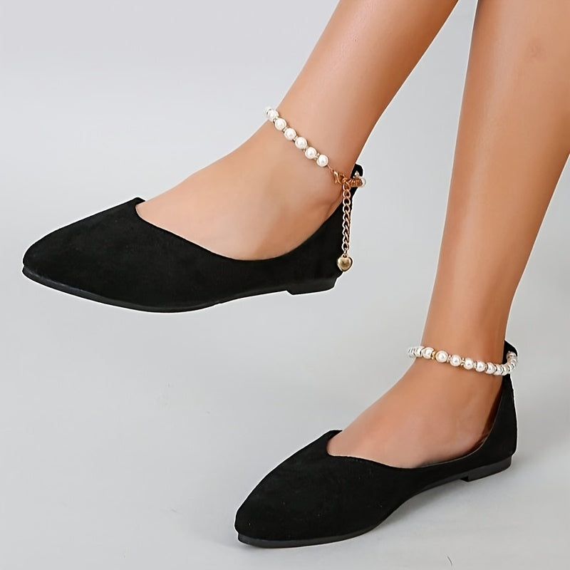 Ballerines noires à bout pointu pour femme - Élégantes chaînes dorées et détails en perles