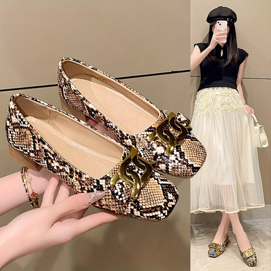 Stylowe damskie baleriny z nadrukiem wężowej skóry – kwadratowe noski i złota klamra