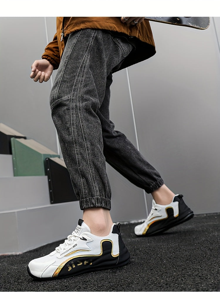 Introducing our Men's Height-Increasing Skate Sneakers, designed with a low-top silhouette and elevated style in mind. Crafted from high-quality PU and featuring a cushioned PVC sole, these all-season sneakers provide superior comfort and breathability, making them perfect for running, skateboarding, or casual wear.