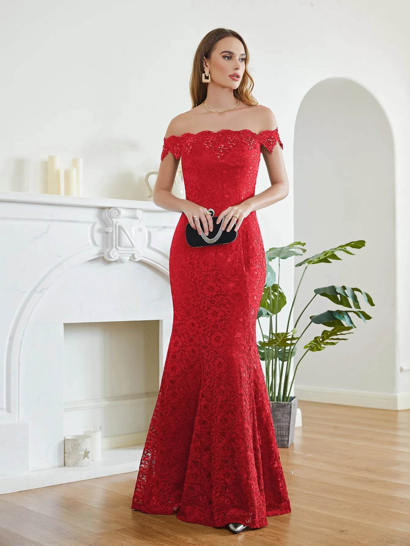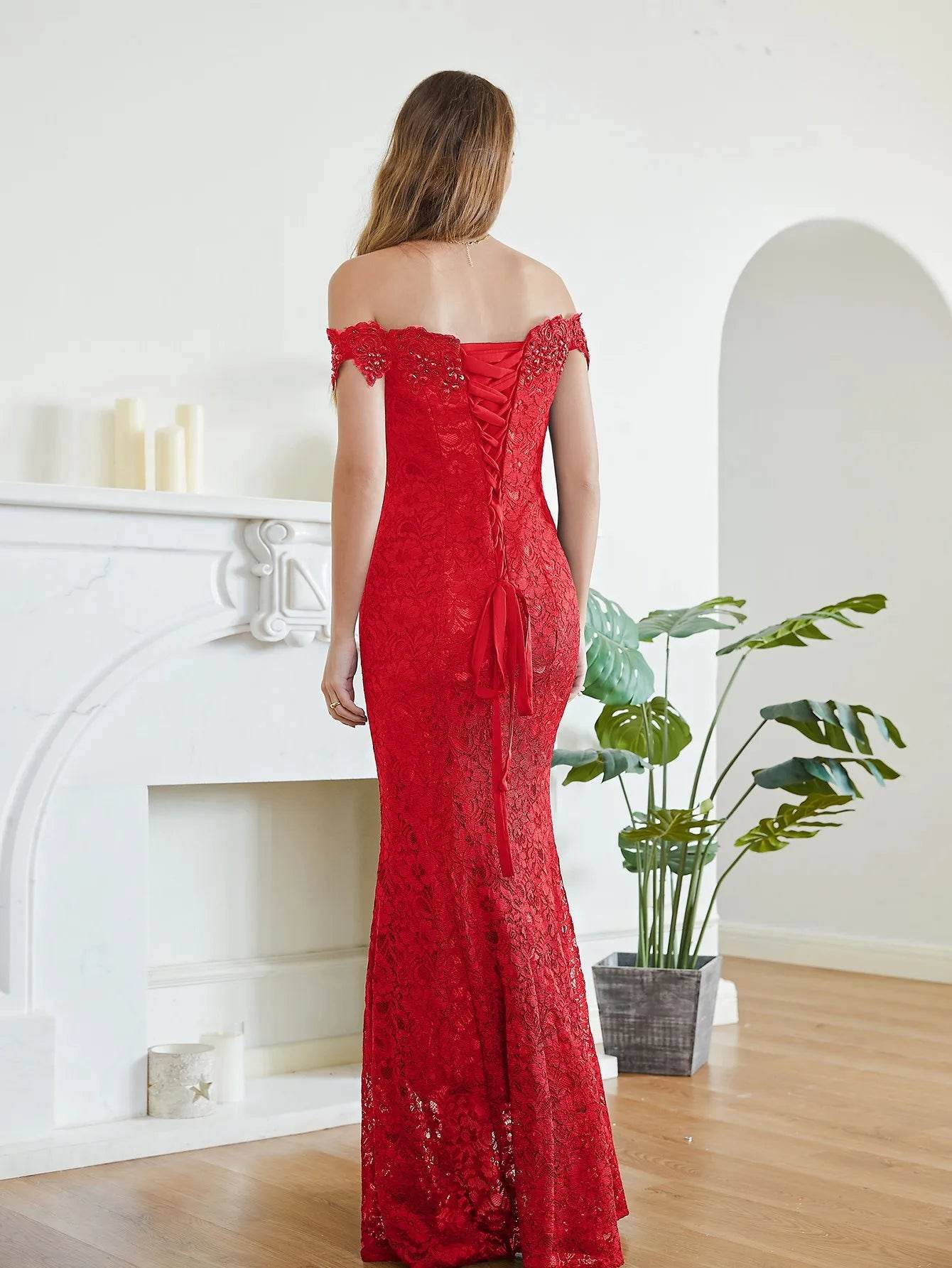 Elevate your special occasion with our Charming Red Mermaid Long Bridesmaid Dress. This exquisite off-the-shoulder gown features beautiful beading and lace, making it the ideal choice for weddings, proms, and other memorable events.