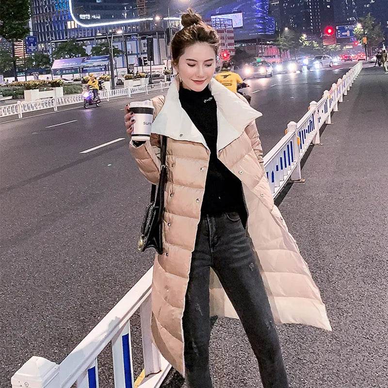 Stay warm and stylish this winter with the 2025 Women Double Sided Down Long Jacket. Crafted from high-quality microfiber and filled with 90% white duck down, this double-breasted coat provides exceptional insulation, making it a perfect choice for modern office ladies seeking both warmth and elegance.