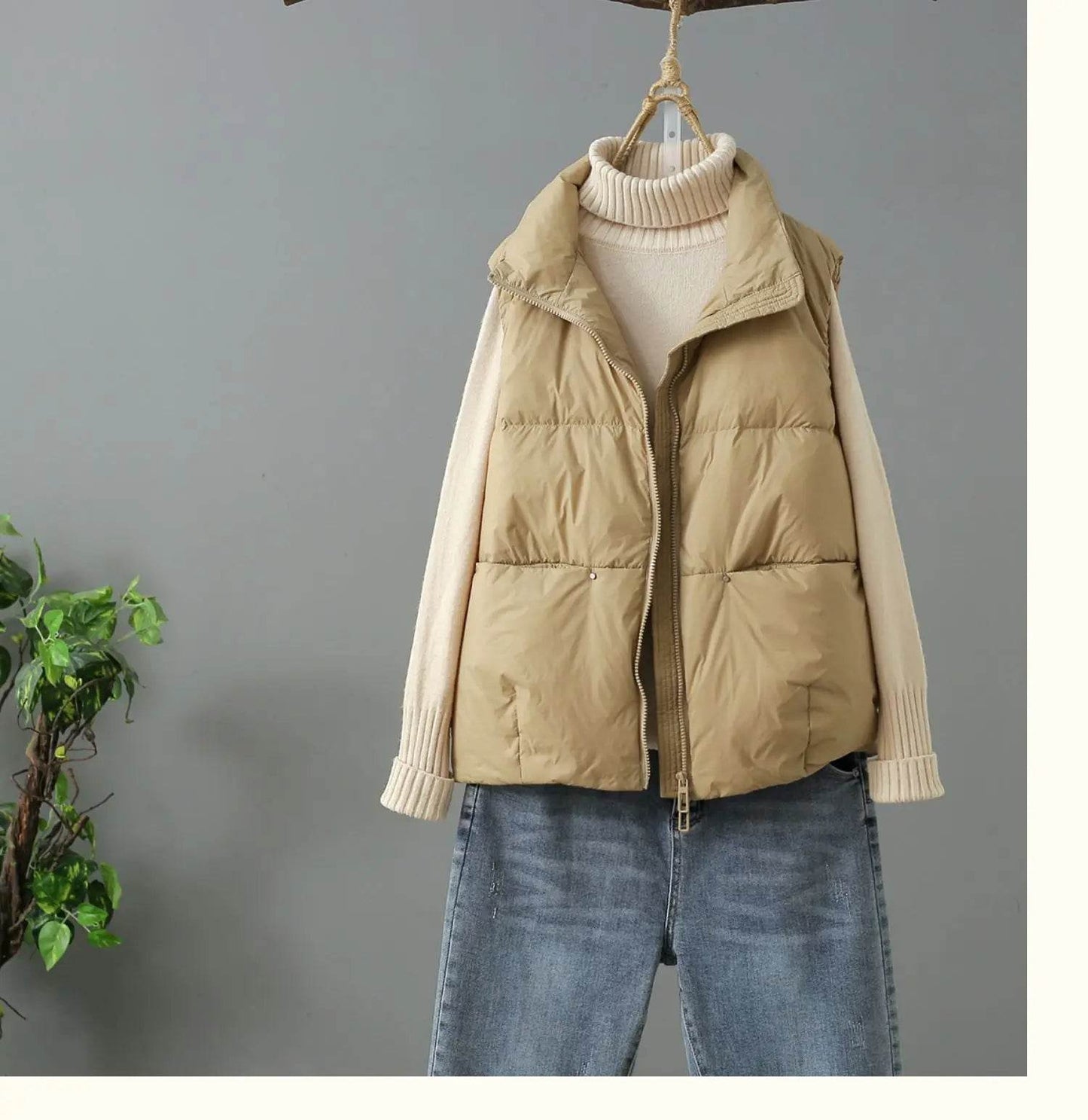 Introducing the Buy Center Women's Oversize Down Vest, an essential addition to your autumn and winter wardrobe. This lightweight, sleeveless vest combines style and comfort, making it perfect for middle-aged women. Experience superior warmth with its high-quality white duck down filling while enjoying a fashionable look.
