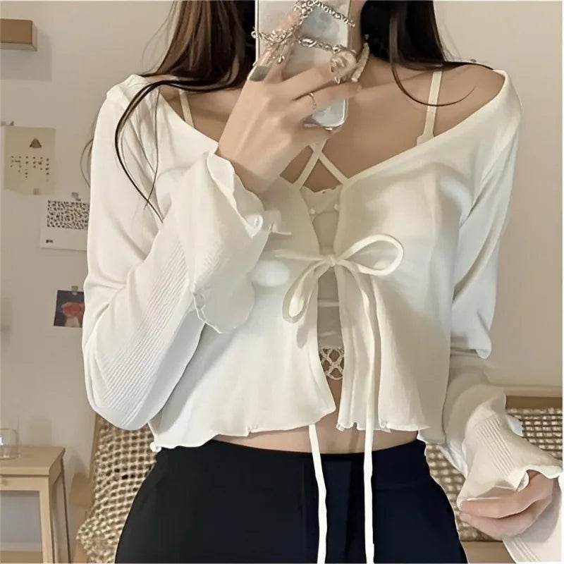 Introducing our White Knitted Cardigan, the perfect stylish and functional layer for spring and summer. This lightweight knitwear features a charming lace-up design and flare sleeves, blending comfort with elegance for a versatile addition to any wardrobe.